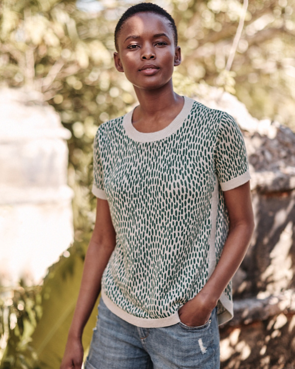 A sweater tee with attitude. Seasonless in a soft and well-textured linen knit, with an easy, comfy silhouette that goes to exciting places thanks to a curvaceous hem and dramatic overlapping side vents.