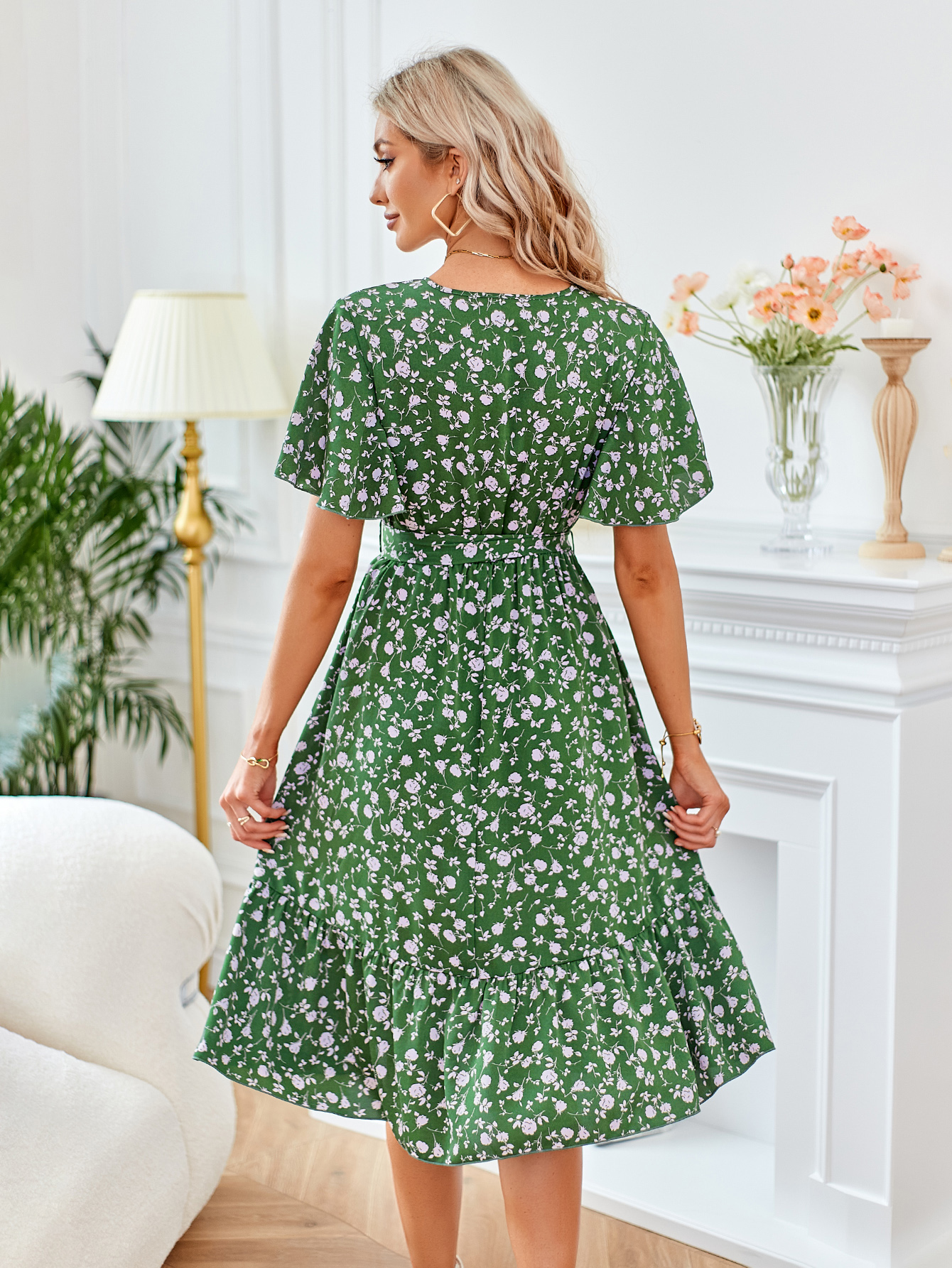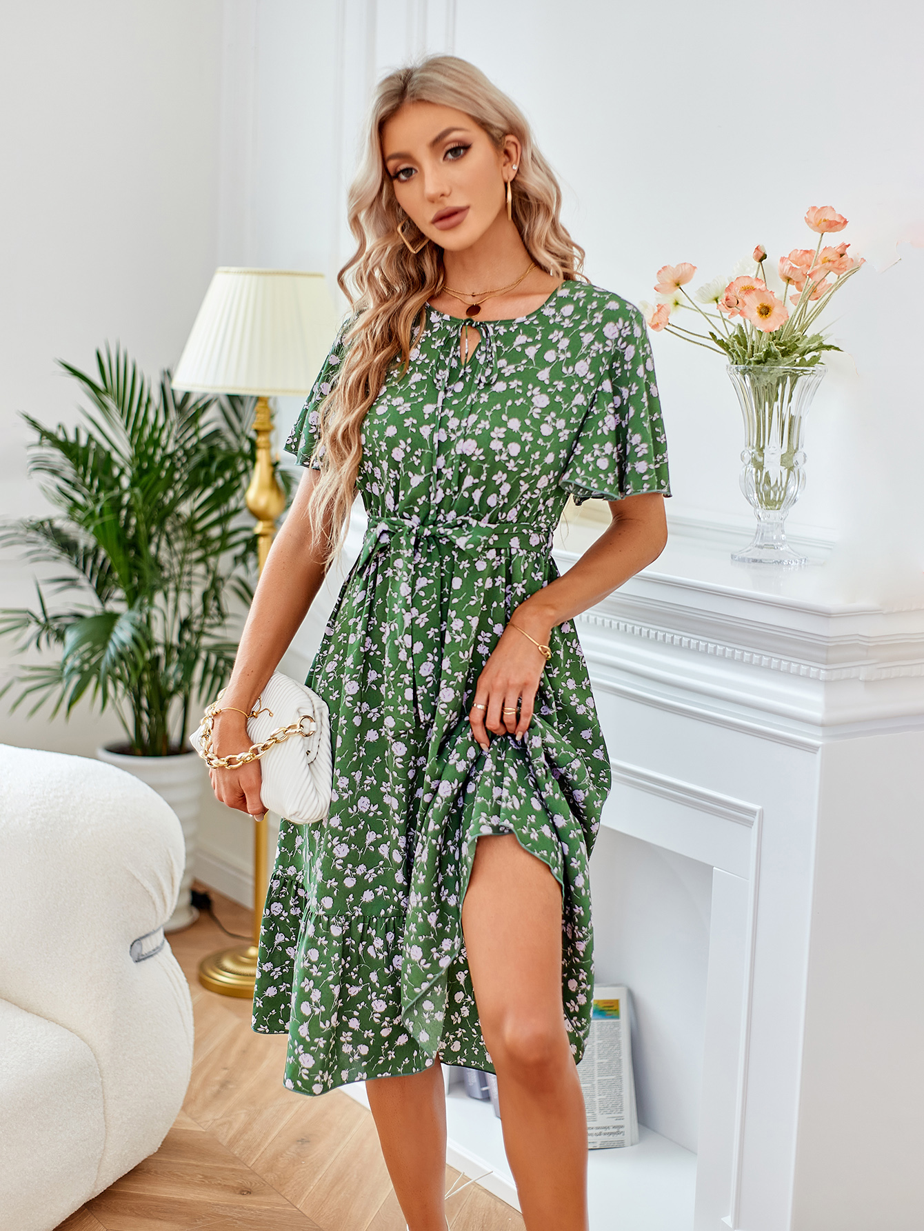 Printed Bow Round Neck Waist Women's Dresses
