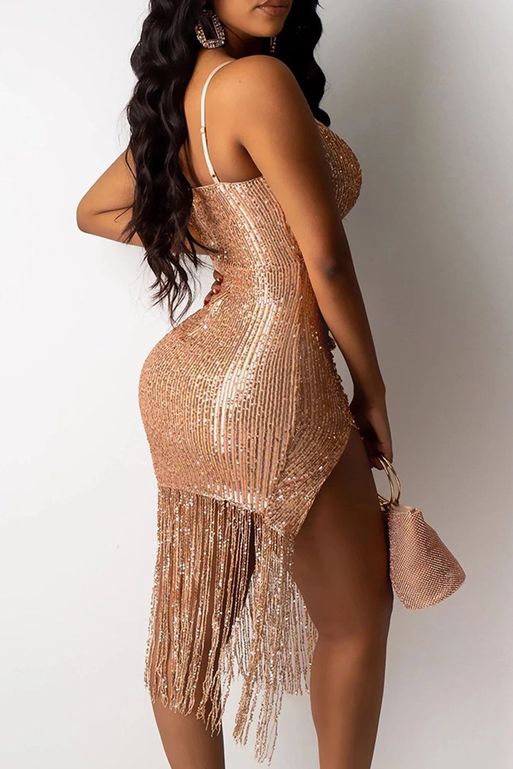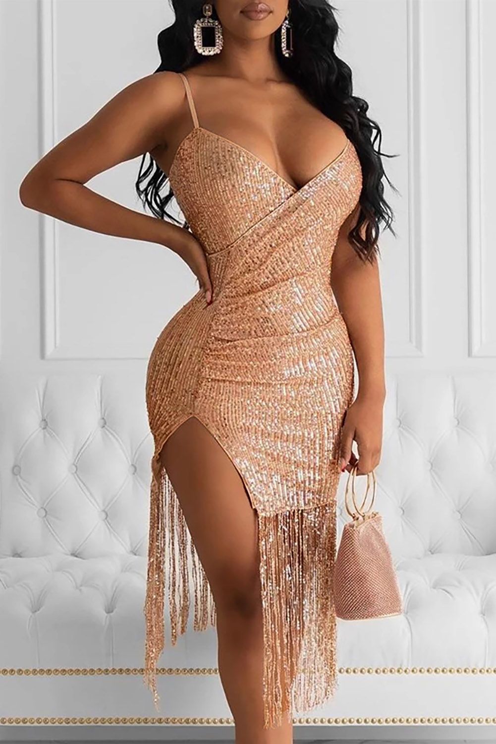 Rose Gold Sequins Ruched Slit Fringe Dress