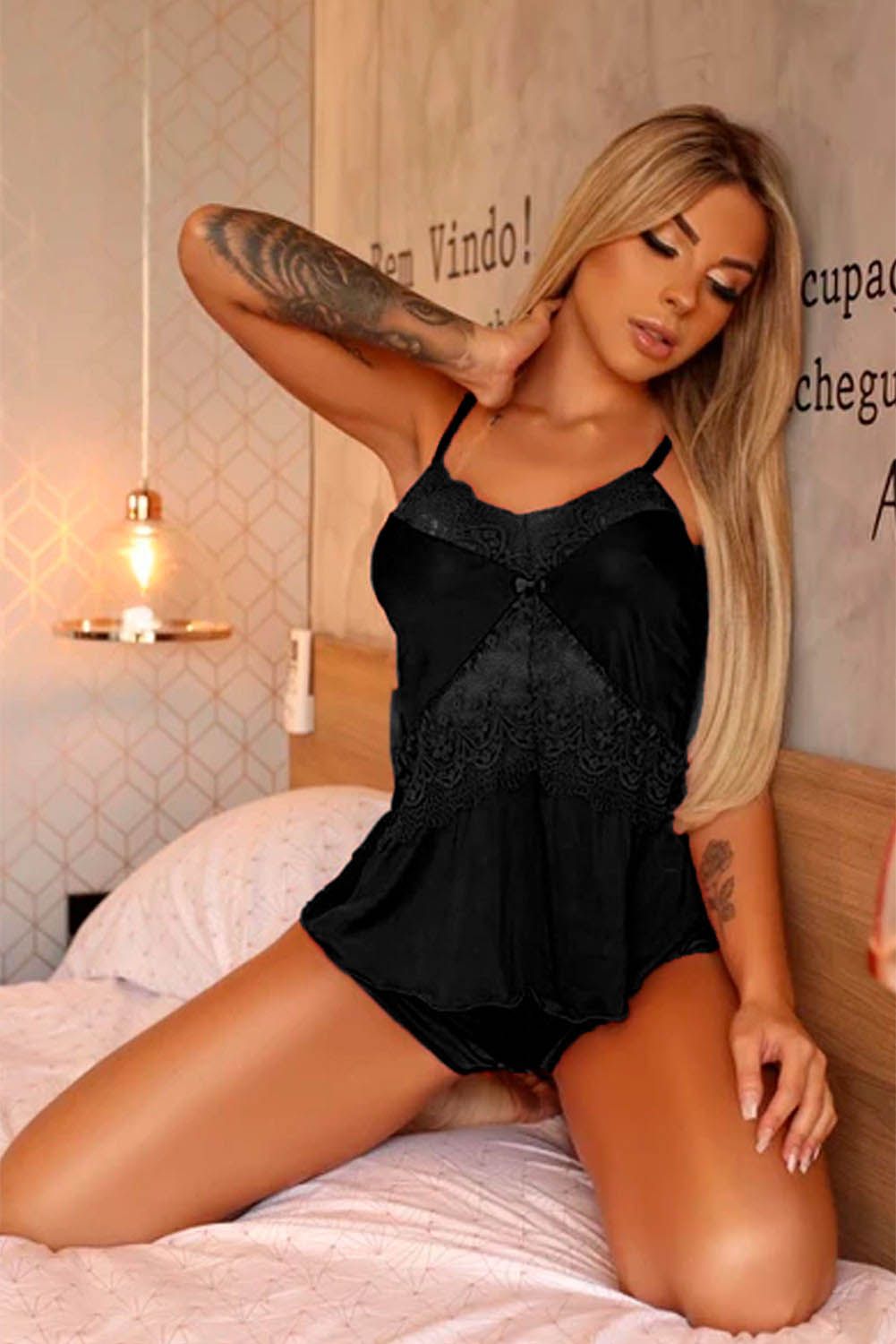 Black Lace Patchwork Cami Shorts 2 Pieces Pajamas Set