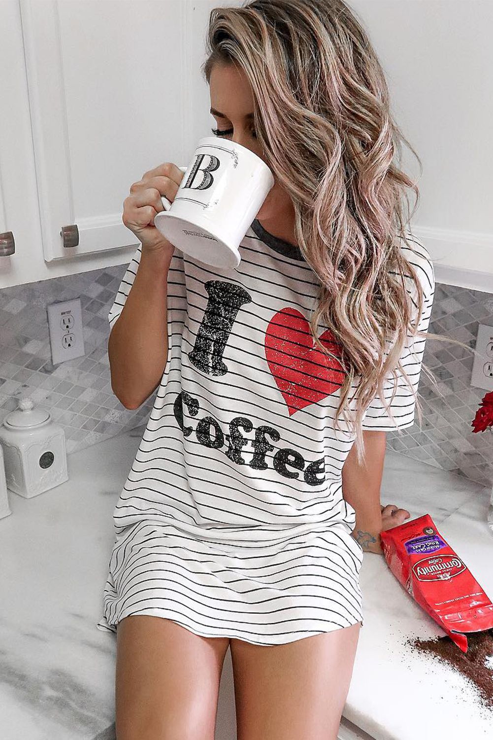 I Love Coffee Graphic Striped Pajamas Dress