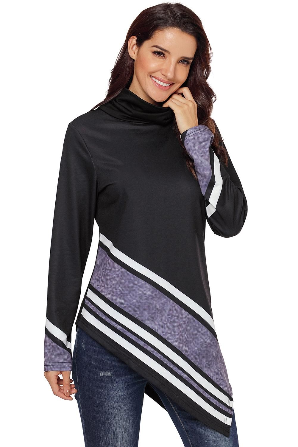 Black Asymmetric Hemline Printed Cowl Neck Sweatshirt