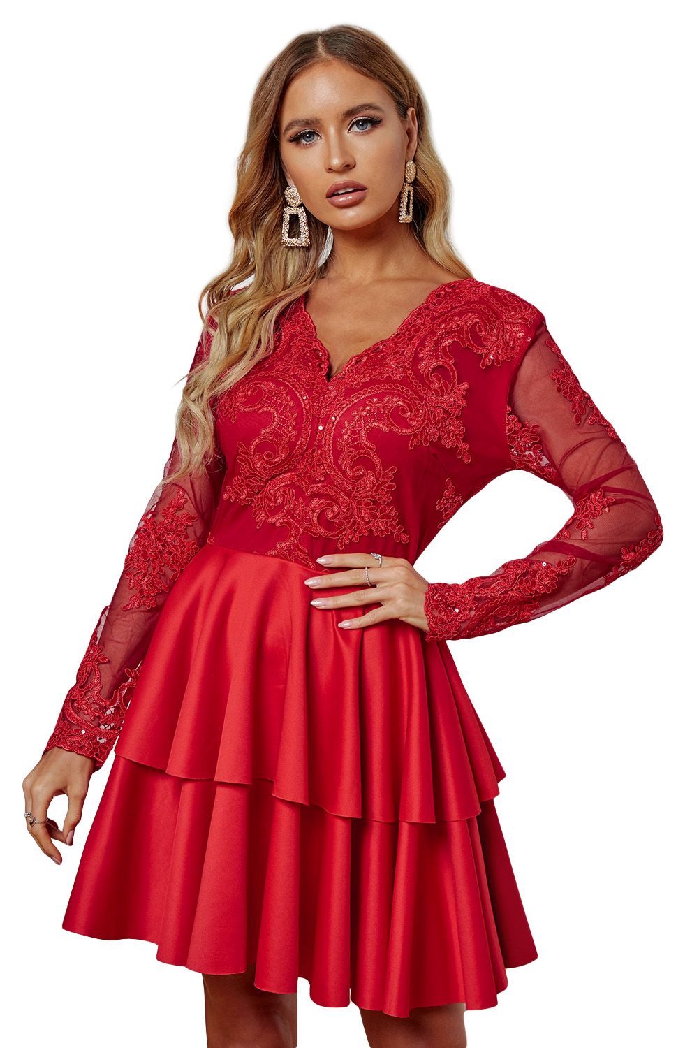 Sheer long sleeve, sexy neckline and embroidered floral pattern