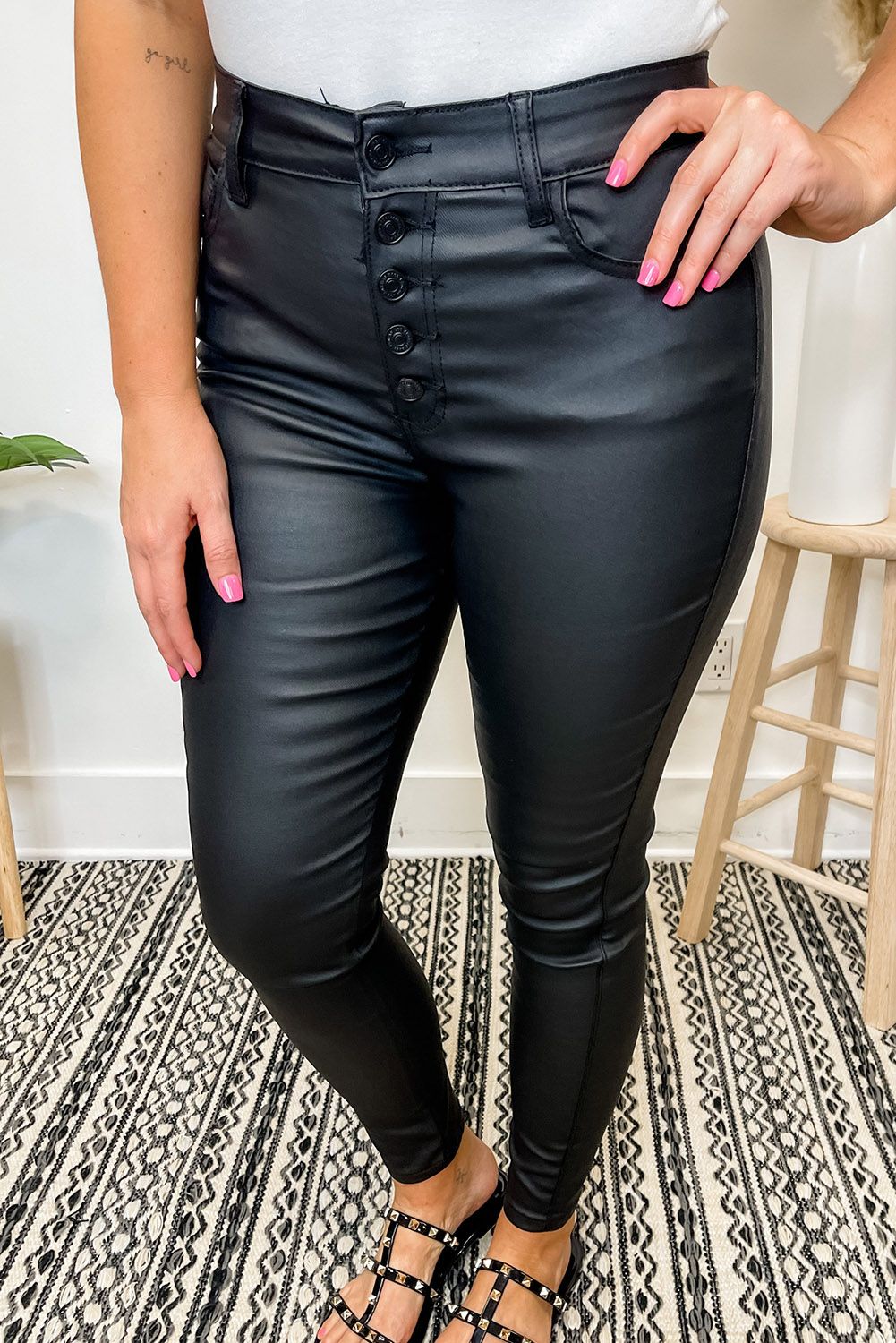 Faux Leather Button Fly High Waist Skinny Fit Pants