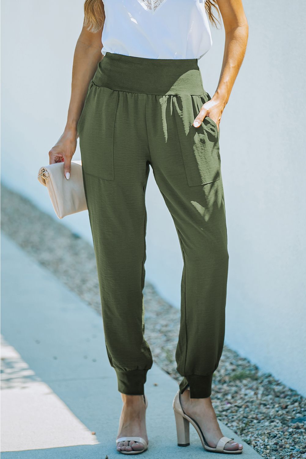 Stretchy high waistband, side pockets and a billowy harem style silhouette