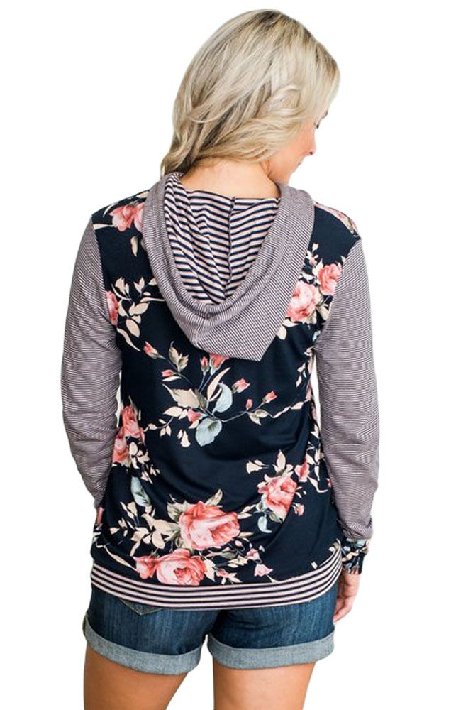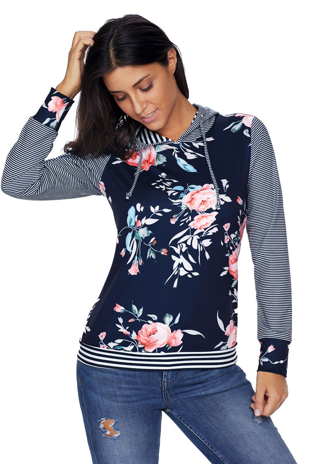 Dark Blue Pinstripe Accent Floral Print Drawstring Hoodie